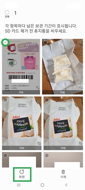 5. 복원하고 싶은 사진을 선택 후 복원 터치하면 끝~~