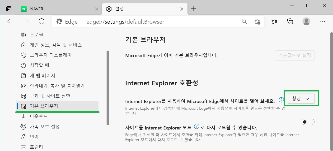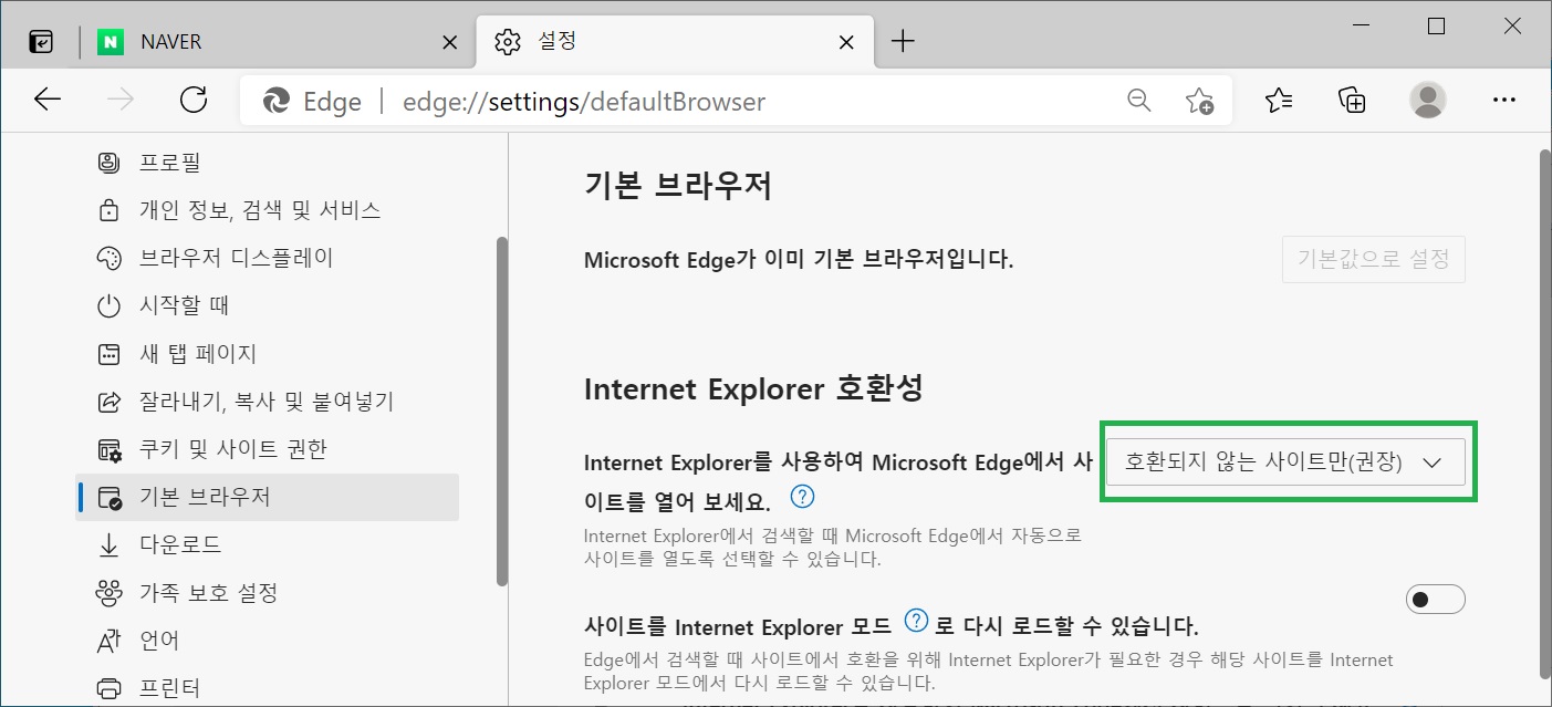 기본 브라우저 - Internet Explorer 호환성 : 호환되지 않는 사이트만(권장)으로 선택해 주면 됩니다.