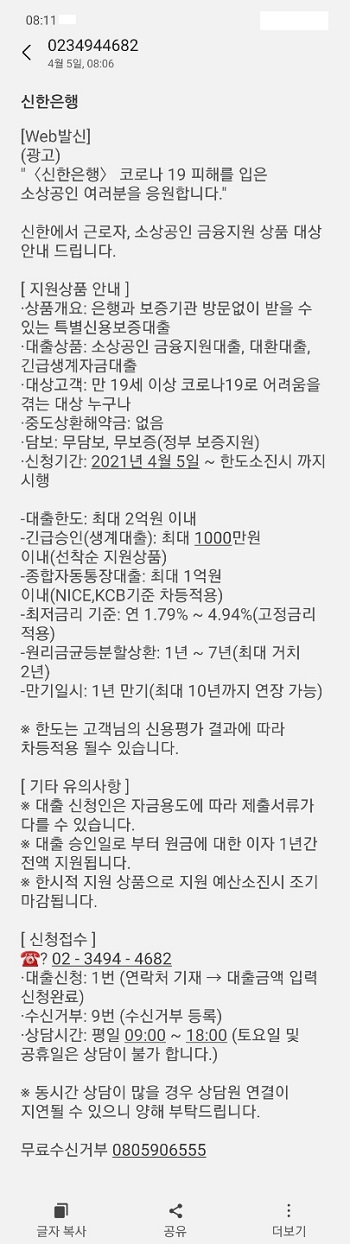 대출한도가 2억으로 개인대출보다 높아졌네요. 어려운 우리 소상공인들을 대상으로 부를 이런 사기 문자를 보내서 피해를 보게 하다니.