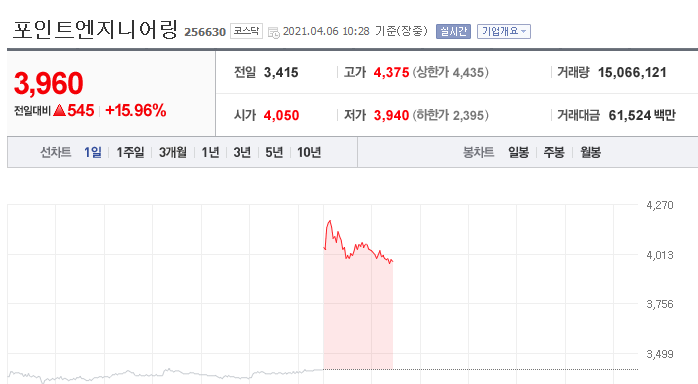 4월 6일 포인트엔지니어링 시가 4050 고가 4375