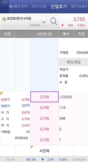 누구나 알 수 있는 시외가 급등주였었습니다. 월요일 정규장 15:30분이 끝나고 16:00 시작하는 시외가에서 에이프로젠 KIC는 8.4% 포인트엔지니어링 9.9% 상한가였던 것입니다.