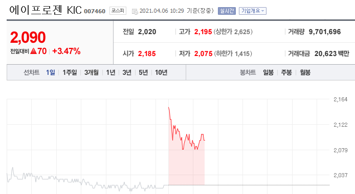 4월 6일 에이프로젠 KIC의 시가는 2185원 고가 2195원