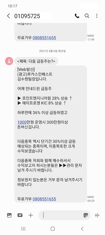 이런 어이가 없는 문자를 얼핏보면 진짜 급등했네라고 생각하는 분들이 있겠죠? 그러니 이런 문자들로 장사를 해서 먹고 사는 거니까요.