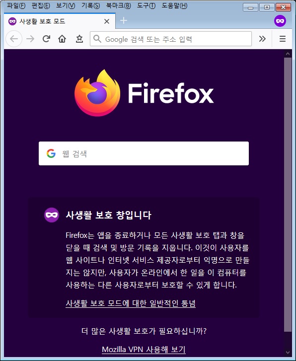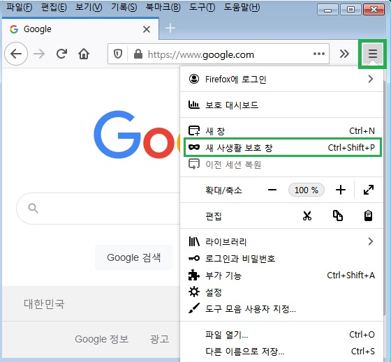파이어폭스 실행 후 삼선 - 새 사생활 보호 창을 클릭