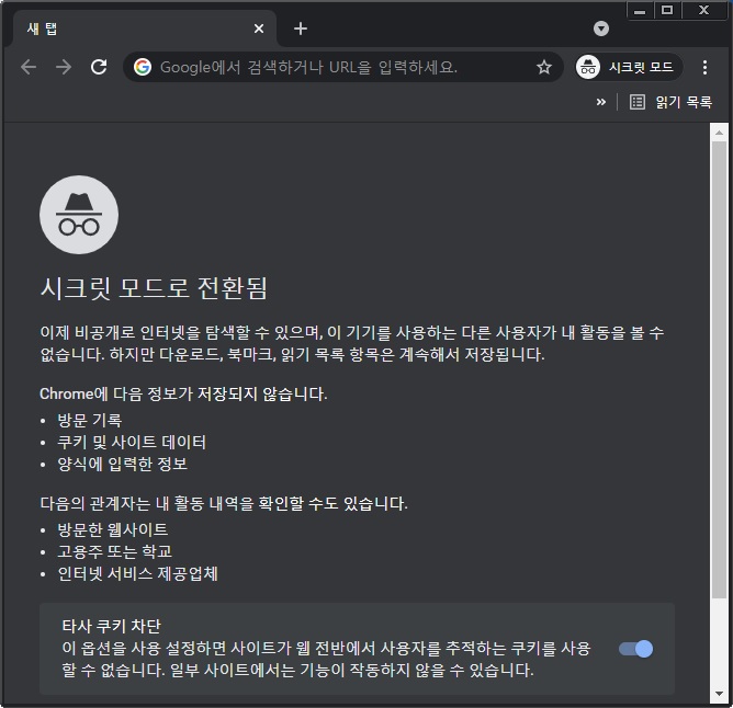 시크릿 모드를 알려주는 블랙테마가 열립니다.