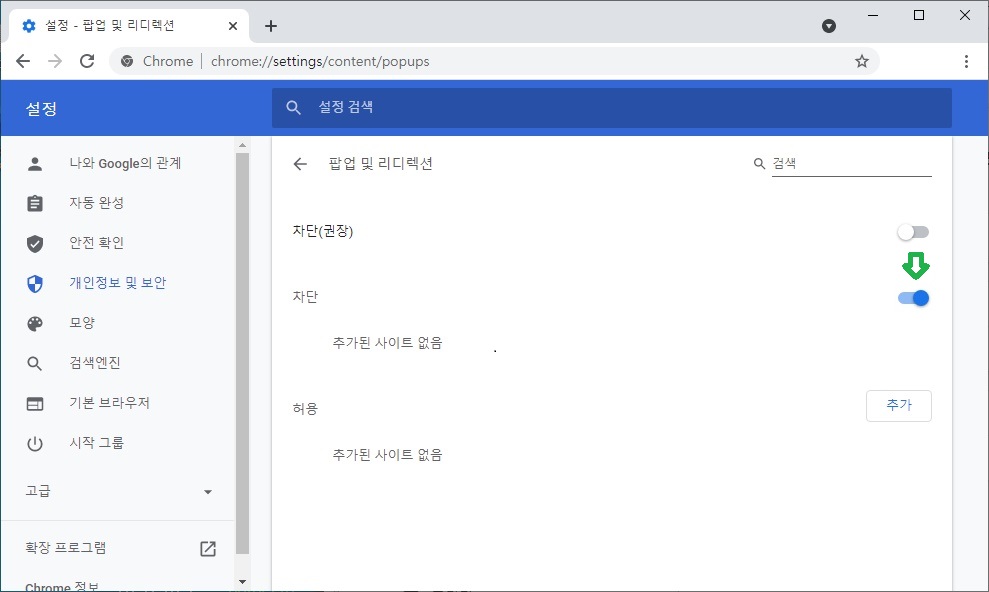 차단(권장) : 단추를 활성화로 바꿔주면 팝업차단 해제가 됩니다.