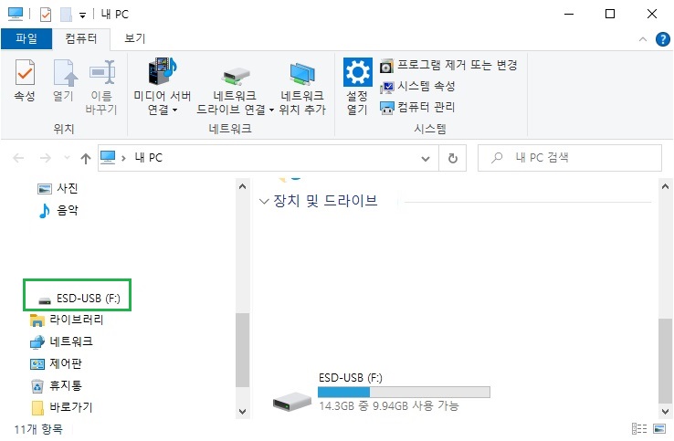 윈도우 10을 설치하고 내 PC로 들어오면 본체에 꽂아둔 USB 외장메모리 드라이브가 2개로 뜨는 경우가 있습니다.