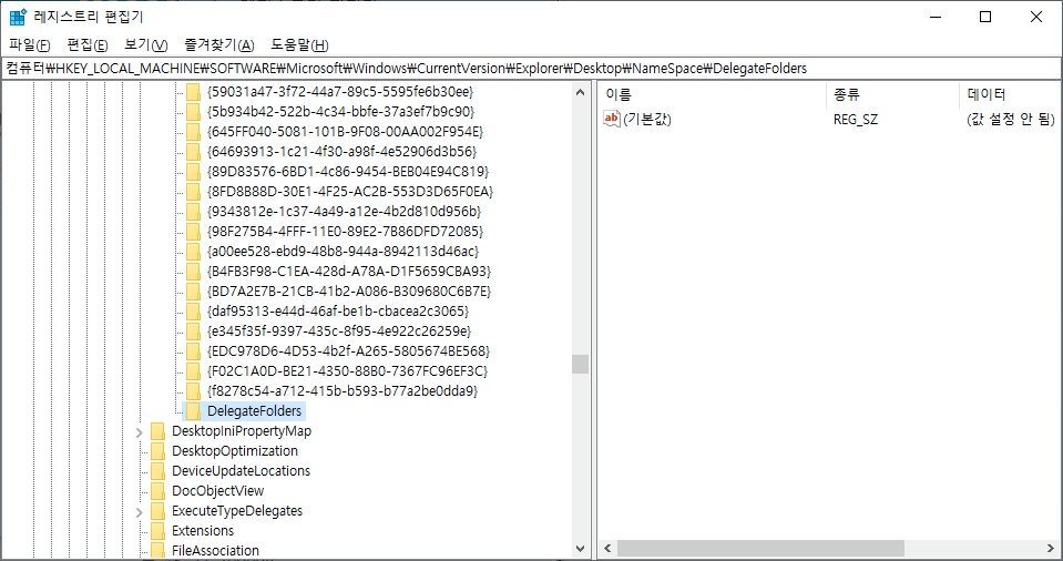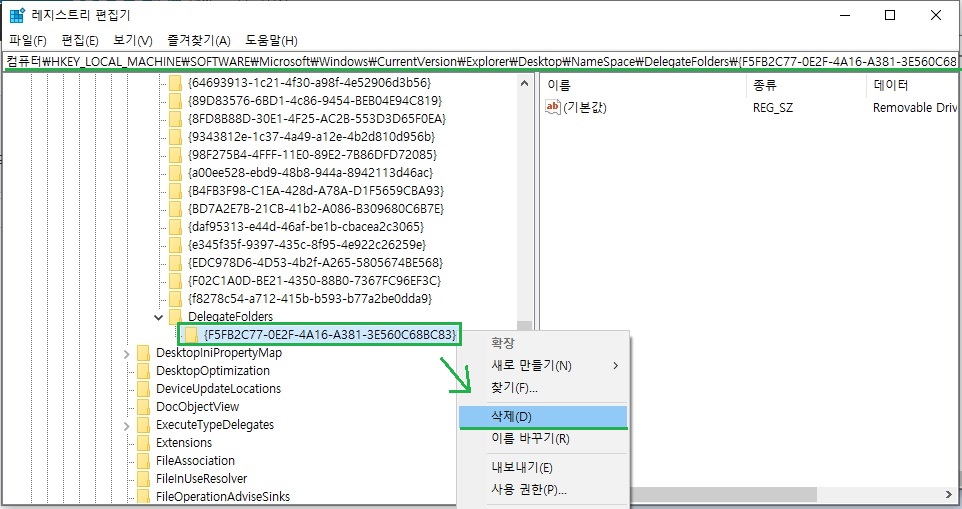 경로를 찾아서 {F5FB2C77-0E2F-4A16-A381-3E560C68BC83} 값을 삭제 해주면 됩니다.