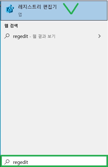 작업 표시줄 - 돋보기 'REGEDIT' 입력 후 레지스트리 편집기를 클릭