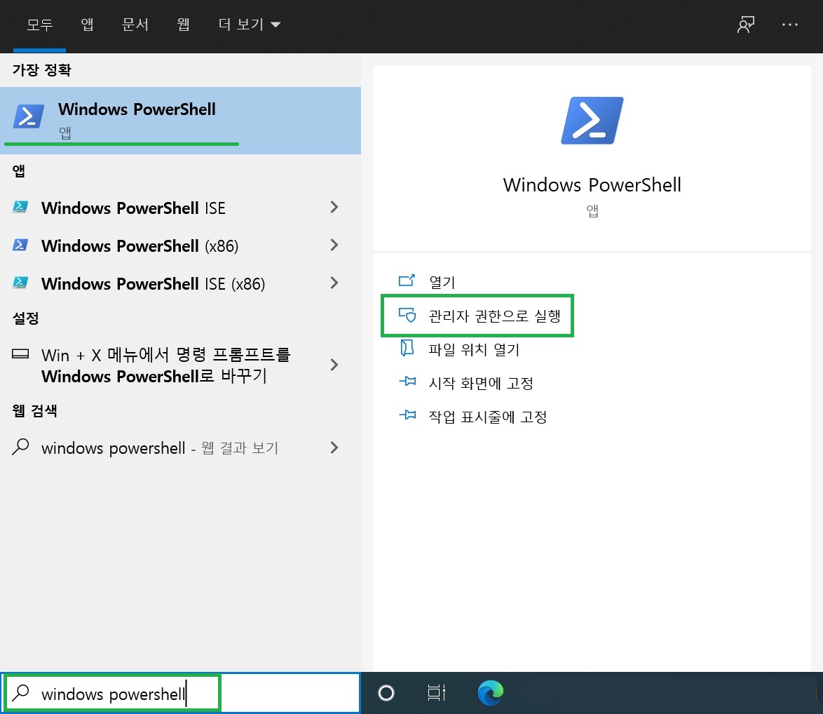1. '작업 표시줄 - 돋보기 - Windows PowerShell - 관리자 권한으로 실행'하세요.