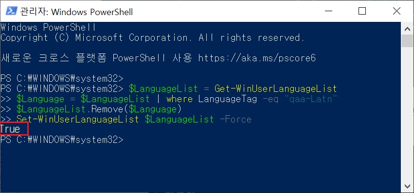 엔터 클릭하고 True 나오면 QAA 알 수 없는 로캘(qaa-Latn)은 삭제됩니다.