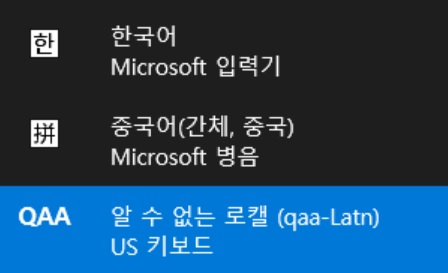 작업 표시줄 오른쪽 한영 키보드 입력기에 QAA 알 수 없는 로캘(qaa-Latn)라고 모르는 키보드 입력기가 떴습니다.