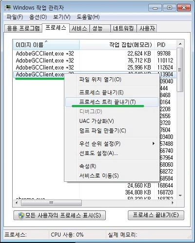 작업 관리자 ( Ctrl + Alt + Del )를 열어서 AdobeGCClient.exe 프로세스를 마우스 우측 클릭 - 프로세스 트리 끝내기를 해주면 Adobe 정품 알림이 일시적으로 사라집니다.