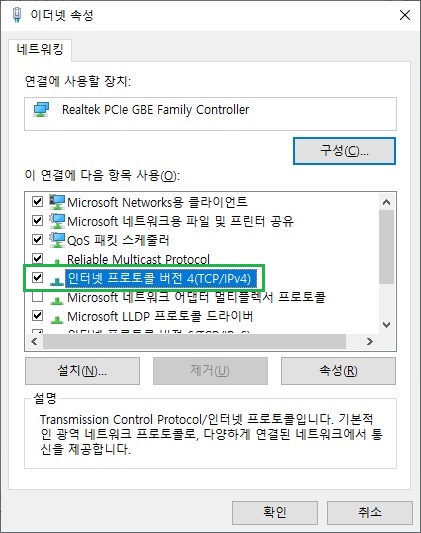 인터넷 프로토콜 버전 4(TCP/IPv4) 목록을 더블클릭 또는 속성 클릭