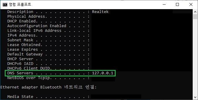 작업 표시줄 - 돋보기 - CMD : 도스창을 열어서 Ipconfig /all 명령어로 네트워크를 확인해 보았습니다.