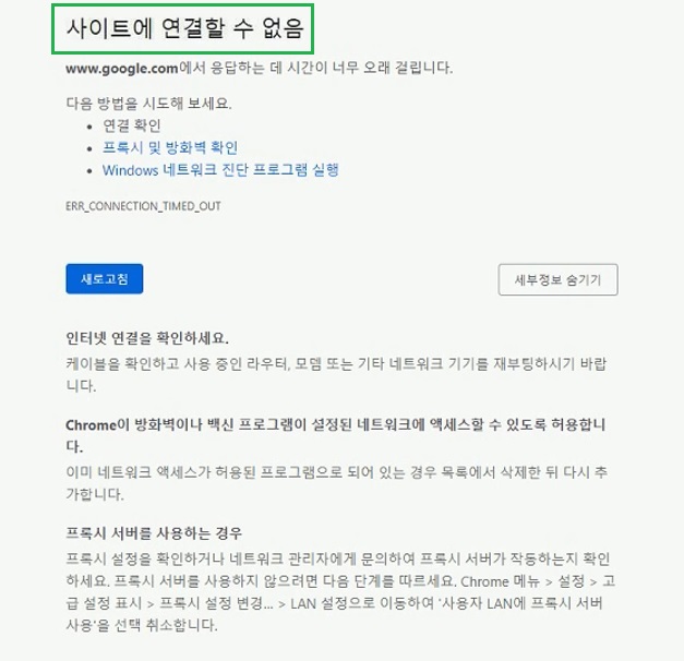 사이트에 연결할 수 없음 창 아래쪽에 인터넷 연결과 방화벽 허용, 프록시 서버 사용 유무를 확인하라고 나와 있으나 모두 정상입니다.