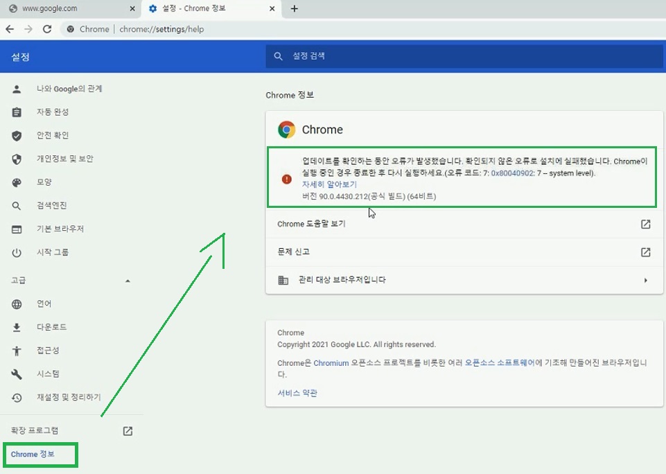 크롬 업데이트가 문제인지 몰라서 크롬 업데이트를 시도했으나 오류가 발생했습니다.