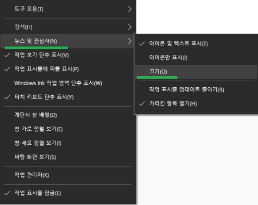뉴스와 날씨 작업 표시줄 광고 삭제 방법(뉴스 더 보기)
