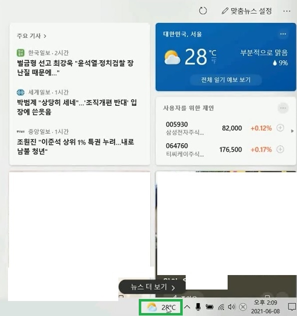 최근에 윈도우 10이 업데이트가 된 후에 작업 표시줄에 날씨와 뉴스 아이콘이 보이고 '뉴스 더 보기'와 '맞춤 뉴스 설정' 창이 뜨고 있습니다. 새로 나온 광고인 줄 착각을 하게 만들어 놨더라고요. 윈도우 10 업데이트를 하지 않은 컴퓨터에서는 아직 보이지 않을 수 있습니다. 뉴스와 날씨 아이콘이 작업 표시줄에 뜨더라도 놀라지 마시기 바랍니다.