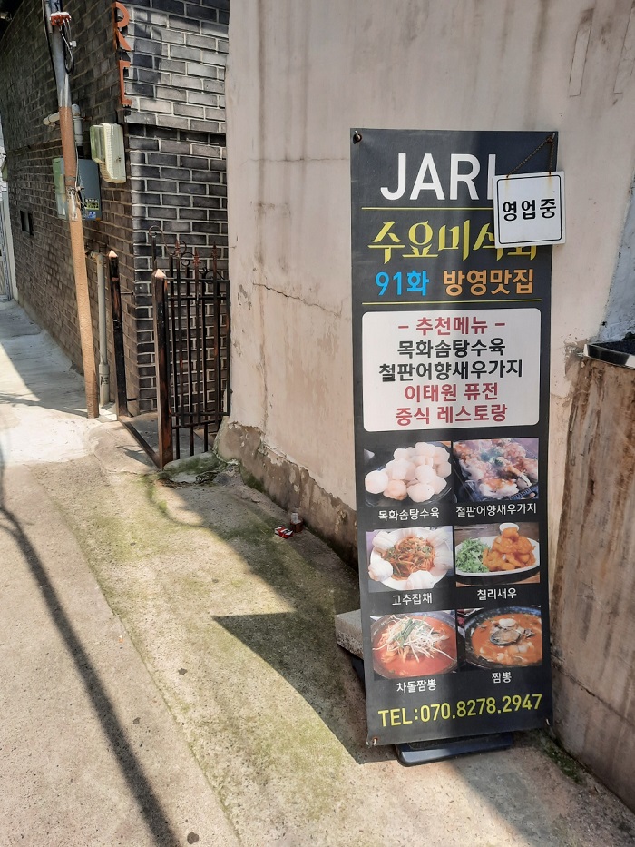 동생과 이태원 아트페어를 구경하기 전 점심을 먹으로 돌아다니다 우연히 수요미식회 출연이라는 중화식당 간이 간판을 봤습니다. JARI? 자리? 이름 참 ㅋ. 주변에 마땅히 먹을 식당이 없어서 그냥 한번 들어가봤습니다. 식당으로 들어가는 문이 작아서 여기가 뒷문인가? 라는 생각이 드네요. 간이 간판이 없었다면 식당이라는 생각도 못했겠네요. 거리엔 사람이 없었는데 식당에는 손님들이 많네요. 식당의 크기도 작네요.