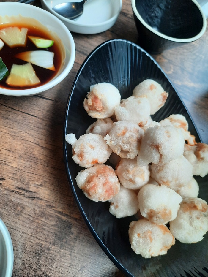 메인 음식 목화솜탕수육, 찹쌀 탕수육의 쫄깃함이 마음에 들고 길다란 탕수육만 보다가 동그란 탕수육을 보니 낮설었지만 이것 또한 아이디어가 좋네요. 오래 씹어도 고기의 잡냄새가 없습니다. 잘하는 집이구만요. 고기에 밑간을 하지 않았는지 자극적인 맛없이 좋게 말하면 본연 그대로의 맛, 나쁘게 말하면 싱거움. 그러나 이것 또한 탕수육 소스를 찍어 먹으면 해결되는 문제입니다.