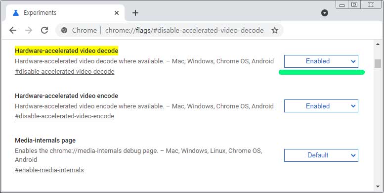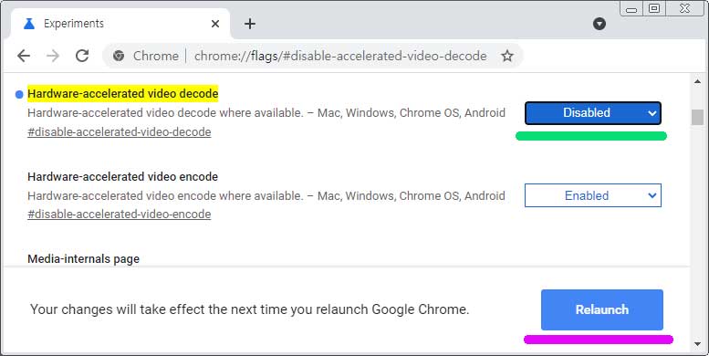 크롬을 실행하고 주소창에 chrome://flags/#disable-accelerated-video-decode 을 입력하세요. 복사 후 붙여넣기를 하시면 됩니다.