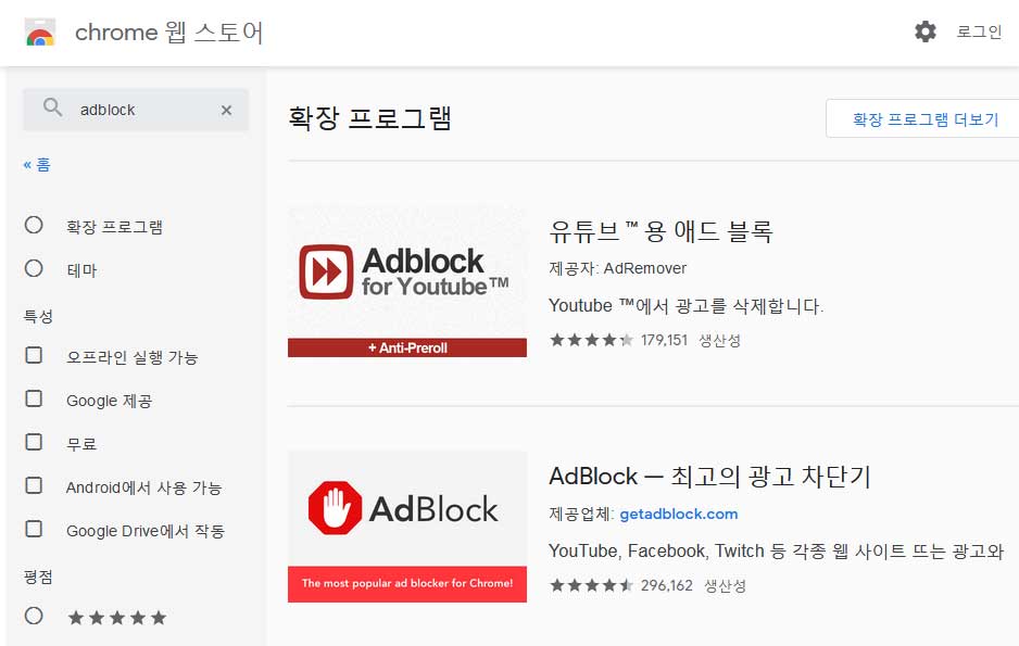 크롬 확장프로그램에서 애드블록을 설치하는 방법입니다. 이 방법은 확실하게 유튜브 광고시 검은화면 해결방법입니다. 그러나 유튜브에서 광고를 꼭 봐야하는 분들이 계실 수 있으니 그런 분들은 두 번째 방법을 이용하시기 바랍니다.