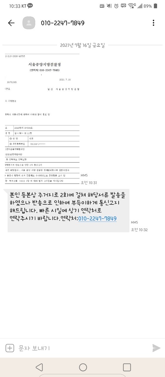 검찰청에서 누가 개인 휴대폰 번호로 연락이 올까요? 바보같은...보이스 피싱놈들.